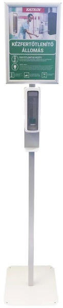 KATRIN Állványos Kézfertőtlenítő Állomás: Higiénikus megoldás minden helyzetre! ? Biztosítsa a kézfertőtlenítés lehetőségét vendégeinek és kollégáinak a stílusos KATRIN kézfertőtlenítő állomással. Ideális megoldás intézmények, irodák, éttermek és más közösségi helyek számára. Főbb előnyök:Szenzoros adagoló: Érintés nélküli használat a maximális higiénia érdekében. Lecseppenésgátló: Megakadályozza a folyadékcseppek okozta szennyeződéseket. Mobil állvány: Könnyen áthelyezhető, bárhol elhelyezhető. Stabil kialakítás: Nem borul fel, lekerekített talp a kerekes székesek számára is. Infótábla: Használati útmutató vagy reklámfelület. A készlet tartalma: 1 db Fertőtlenítő állvány 1 db Szenzoros adagoló (500 ml-es tartállyal) 1 db Lecseppenésgátló 1 db Infótábla 4 db 1,5 V bébi elem (LR14) Technikai adatok:Jellemző ÉrtékAdagoló típusa Szenzoros, automataUtántöltő 500 mlEnergiaellátás 4 db 1,5 V bébi elem (LR14) - tartozékFelhasználás Intézmények, irodák, vendéglátás stb. A KATRIN kézfertőtlenítő állomás segít javítani a kézhigiéniai színvonalat, megelőzni a kórokozók terjedését és hatékonyan védekezni a járványok ellen. Fontos része a munkahelyi higiéniai programoknak.